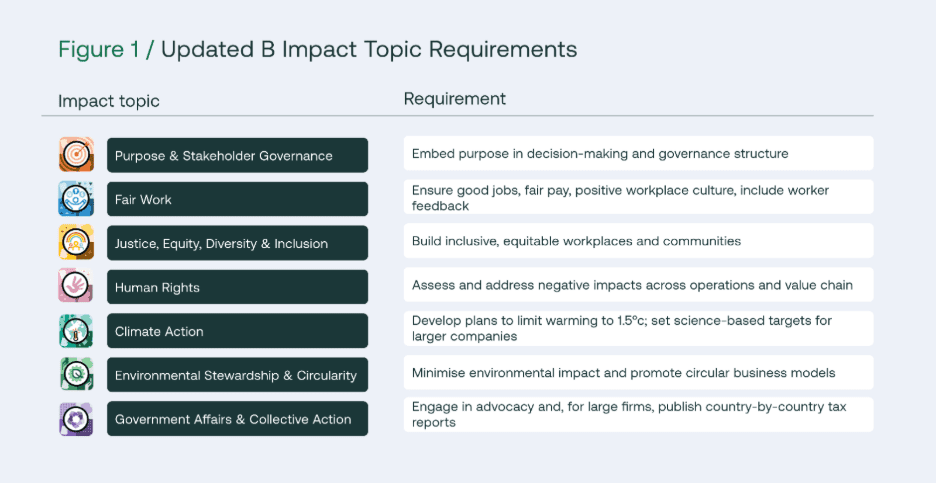 - The old B Corp standards required 80 points across 5 impact areas, with no minimum in any single area. The new standards require minimum performance across all 7 mandatory impact topics. Cherry-picking is no longer possible.