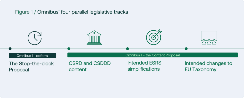 The Omnibus Directive implements a “stop-the-clock” approach, granting a two-year deferral on the application of CSDDD, as well as CSRD reporting deadlines for waves 2 and 3 companies,. This pause is meant to allow enough time for additional content-related developments to be adopted.