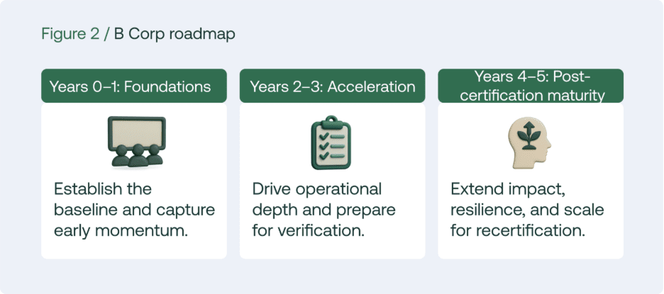 Transform standards into action with a phased, mid-market plan aligned to the B Impact Assessment, tracking progress continuously.