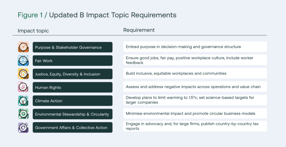 Under the new standards, legacy impact areas have been consolidated into seven core impact topics: Purpose & Stakeholder Governance, Climate Action, Human Rights, Fair Work, Environmental Stewardship & Circularity, Justice, Equity, Diversity & Inclusion (JEDI), Government Affairs & Collective Action. These topics introduce phased and escalating expectations over time, requiring companies to demonstrate credible foundations, measurable progress, and continuous improvement (1).