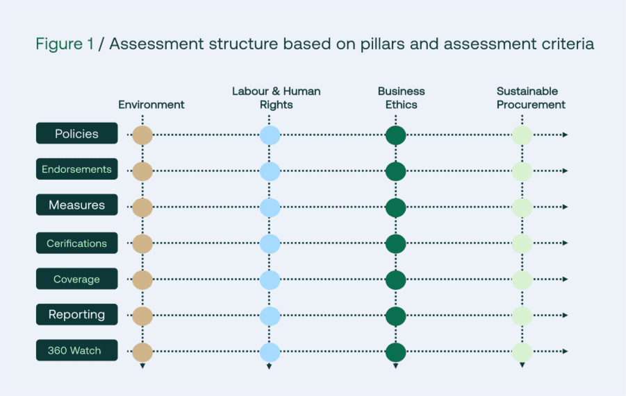Elke pijler wordt beoordeeld via zeven criteria: beleid, erkenningen, maatregelen, certificeringen, dekking, rapportage en 360 Watch.