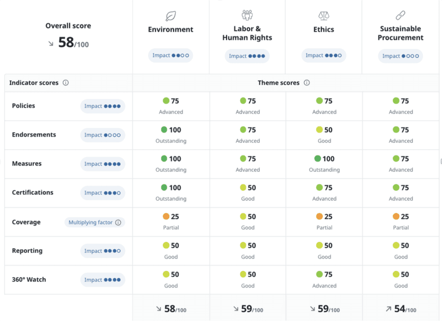 Gerichte beoordeling met focus op relevante pijlers zoals ethisch ondernemerschap en arbeidsrechten. Opgesteld beleid, transparante rapportage en benutting van externe erkenningen versterkten de geloofwaardigheid.