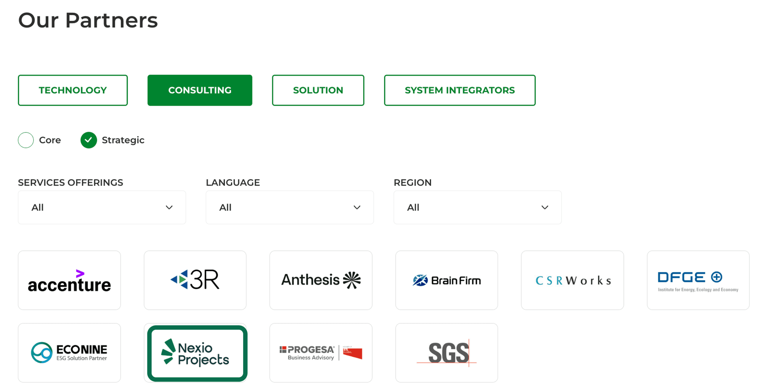 EcoVadis’ partner directory (1) defines the different positions of companies in the ecosystem. Under ‘Our Partners’, you can see all organisations across Technology, Solution, Consulting and System Integration levers. When you click on the ‘Consulting Partners’, you can filter between core and strategic partners.